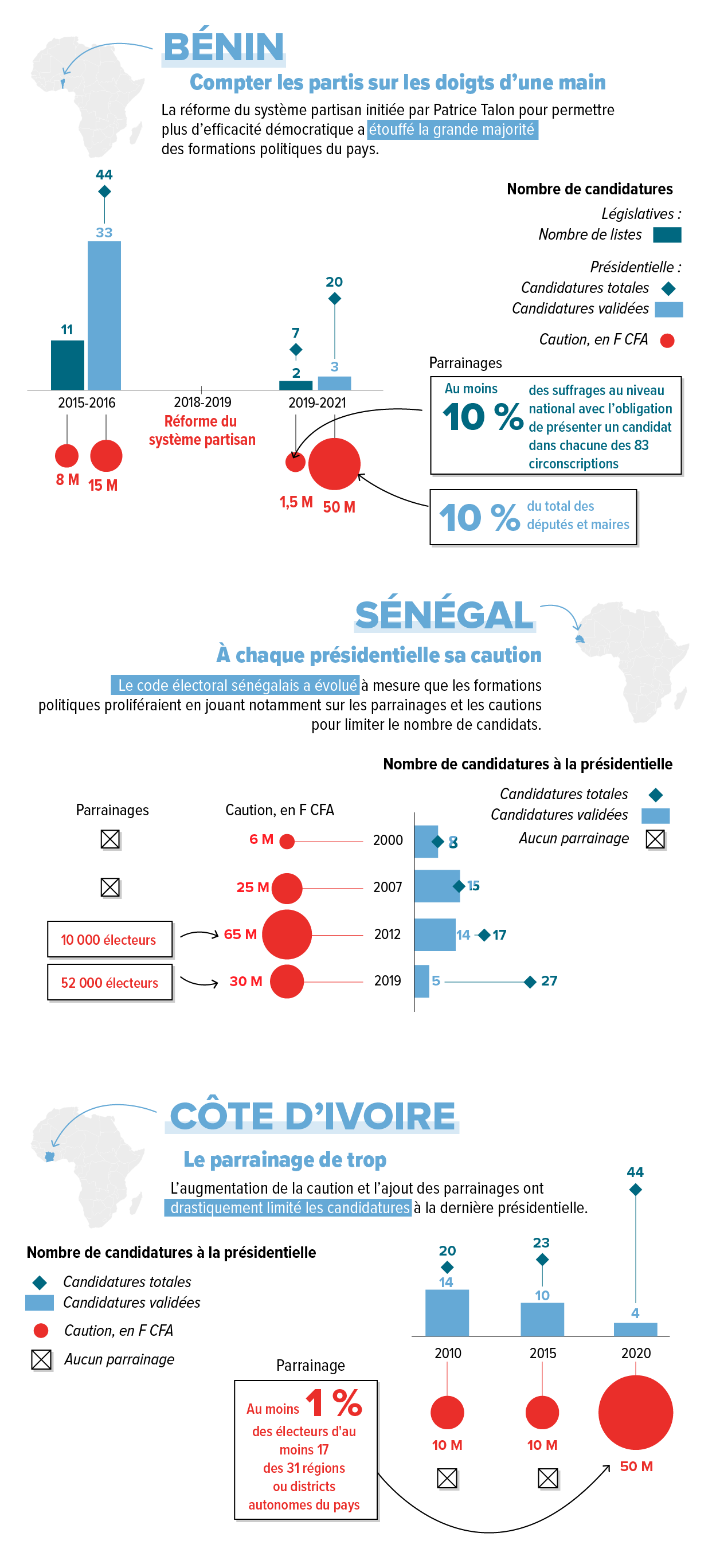Bénin, Sénégal, Côte d’Ivoire… Quel pays reconnaît le plus de formations politiques ? Où demande-t-on la caution la plus élevée pour se présenter à la présidentielle ? Quels procédés de filtrage ont été mis en place ? Quel a été leur impact sur le nombre de candidatures ? Décryptage en infographies.