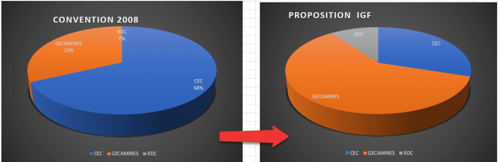 Dans son document, L’IGF propose un changement de la structure du capital de la Sicomines, de sorte que la partie congolaise obtienne 70% [Gecamines (60%) * Etat RDC (10%)] et la partie chinoise 30%. Il s’agit bien d’une proposition de nationalisation !