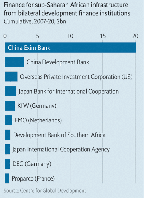 La Chine a des accords similaires de construction des infrastructures avec beaucoup des pays en Amérique Latine, Asie et Afrique. Selon les statistiques de 2020, en Afrique subsaharienne 31 % de projet d’infrastructure sont financées et exécutées par la Chine. Le succès des projets chinois demeure que les banques chinoises acceptent beaucoup plus des risque (taux d’intérêt très bas) mais en visant sur le long terme.
