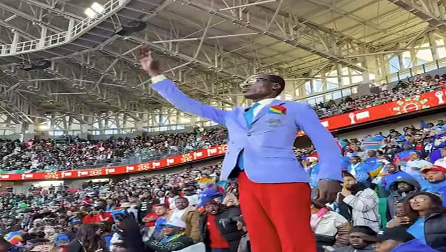 Sa manière d’encourager l’équipe nationale de la RDC en restant debout, immobile, le bras en l’air, la paume ouverte, le regard fixe, est unique.