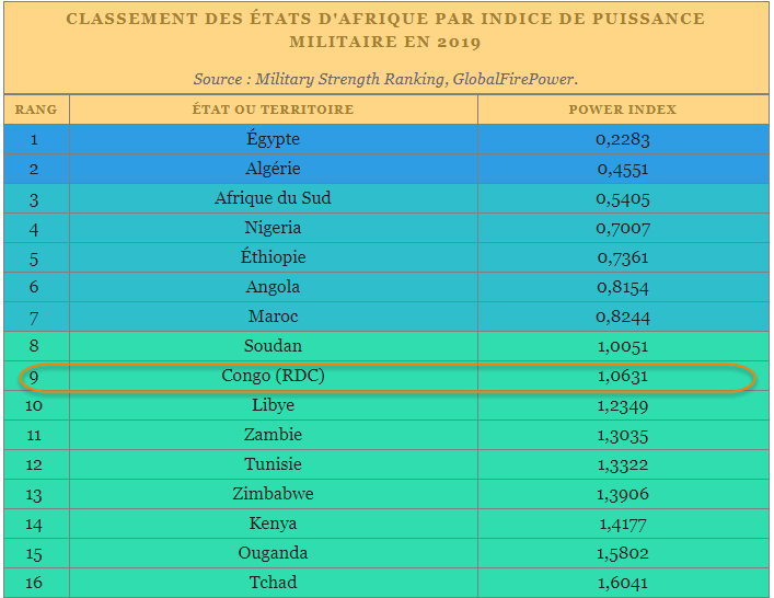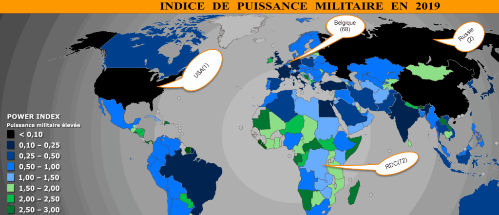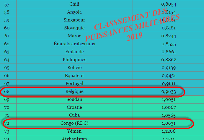 Puissances Militaires par Etat 2019 Classement Index de Puissance par Pays ( ev Belgique RDC) Puissance Militaire Afrique 2019 Navigation de l’article A CELUI QUI CROIT DEFENDRE FELIX TSHISEKEDI EN INSULTANT LUMUMBA En Reponse aux Questions du Combattant: Leadership et Nationalisme en RDC