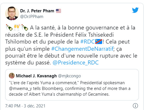 L’Américain Peter J.Pham, ancien envoyé spécial des États-Unis, jamais avare en commentaires, s’est immédiatement réjoui du départ d’Albert Yuma, saluant l’illustration d’une « rupture » avec l’ère Kabila.