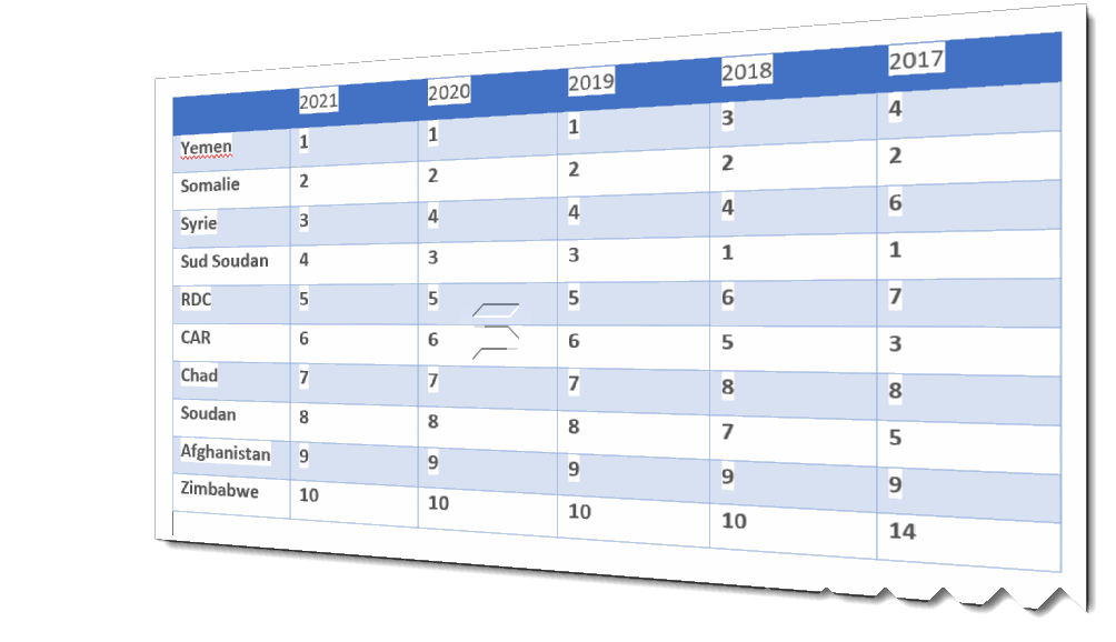 Toute comme la déclaration d’indépendance des États-Unis, notre constitution stipule aussi que nous devons nous opposer à l’installation de l’absolutisme. Certes, dans le contexte d’un pays post conflit et très fragile, le CET a toujours préconisé une certaine tolérance pour la stabilisation ou la consolidation de l’État. Mais l’analyse du classement des pays selon l’indice de la fragilité de 2019 à 2021 correspondant à la durée de Felix Tshisekedi au pouvoir nous amène à constater que le pays s’est fragilisé davantage en passant de la 6ᵉ à la 5ᵉ place (voir le tableau ci-après)