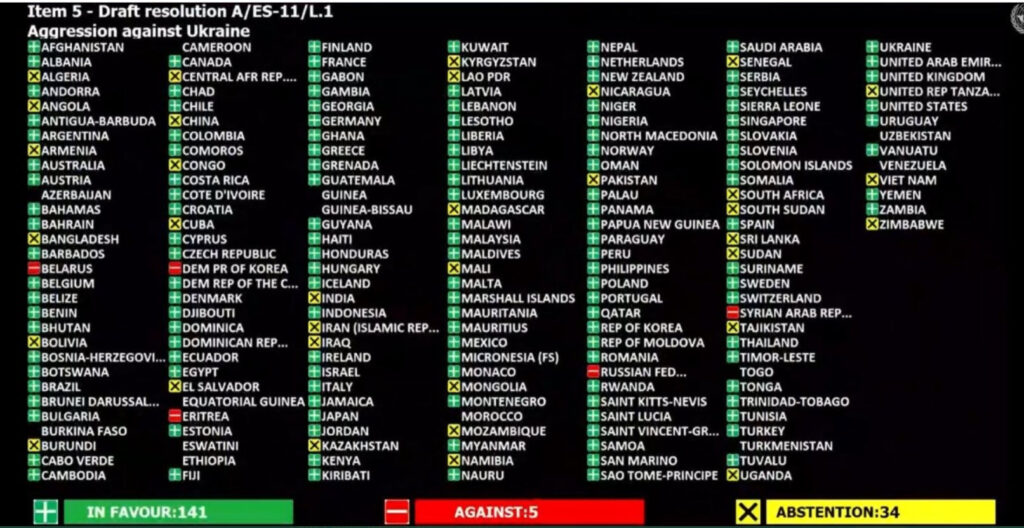 En 2014, une condamnation similaire de la Russie pour l’annexion de la Crimée, qui s’était faite sans effusion de sang à la différence de l’invasion actuelle, avait obtenu 100 voix pour, 11 contre, tandis que 58 pays s’étaient abstenus et que le reste des 193 membres n’avait pas participé au scrutin.