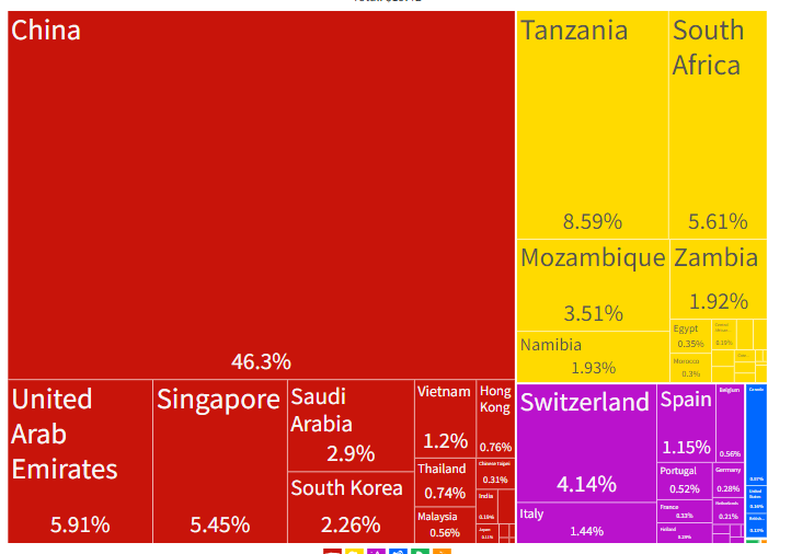 Par ailleurs, un coup d’œil sur le tableau ci-dessous des pays partenaires des échanges commerciaux de la RDC [ en pourcentage du total des exportations] montre que les plus grandes destinations en Afrique des produits congolais sont la Tanzanie ($1,6 milliards) , l’Afrique du Sud ($1,2 milliards), le Mozambique ($690 milions), la Zambie ($370 millions). À l’exception de la Tanzanie, qui est aussi membre de la SADC, les pays de l’Afrique de l’Est ne sont pas les grandes destinations des produits congolais. La suppression des tarifs douaniers par la RDC ne va donc pas stimuler la production industrielle congolaise, mais la consommation des produits industriels de ces pays par les populations congolaises. Tous les pays qui se sont développés (industrialisation) commencent par le protectionnisme. Les États-Unis, le Japon, la Chine, la Corée du Sud n’ont pas commencé par l’ouverture des frontières ou le libre-échange avec les pays voisins – bien au contraire.